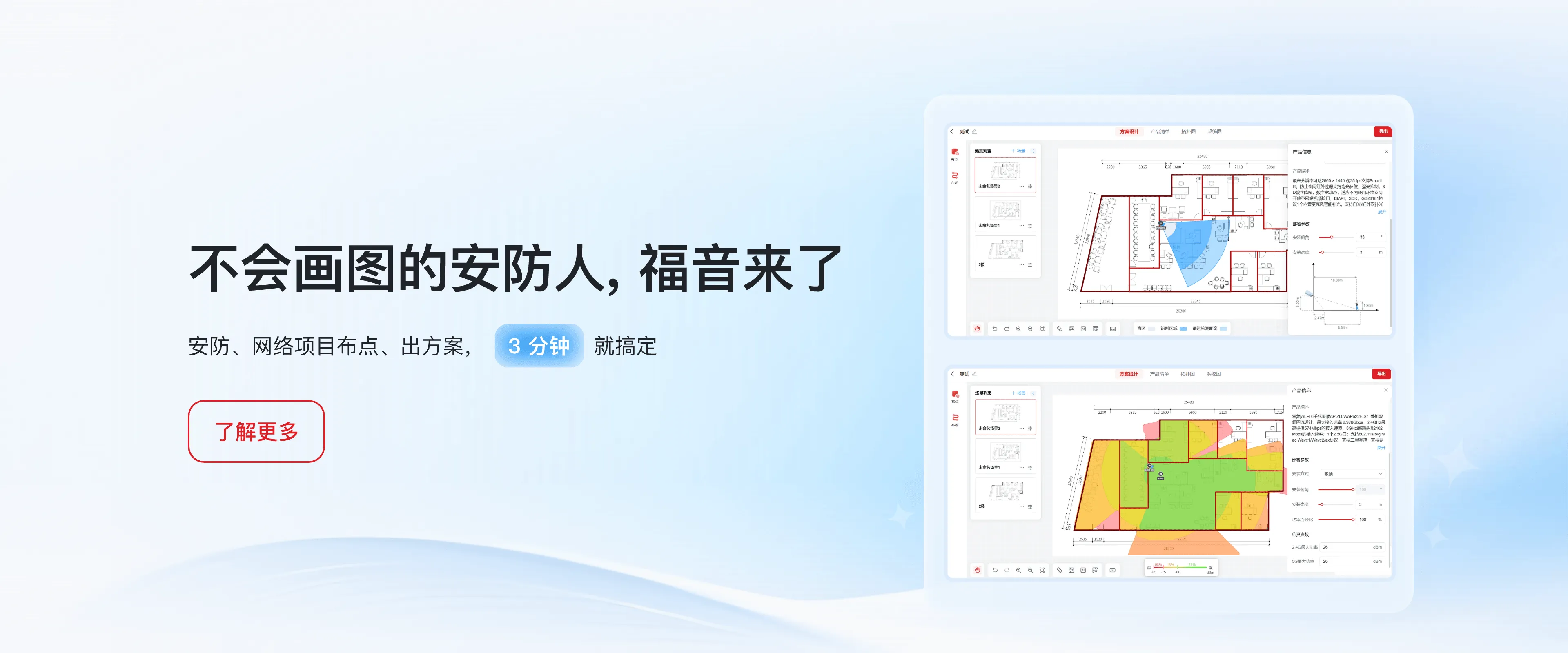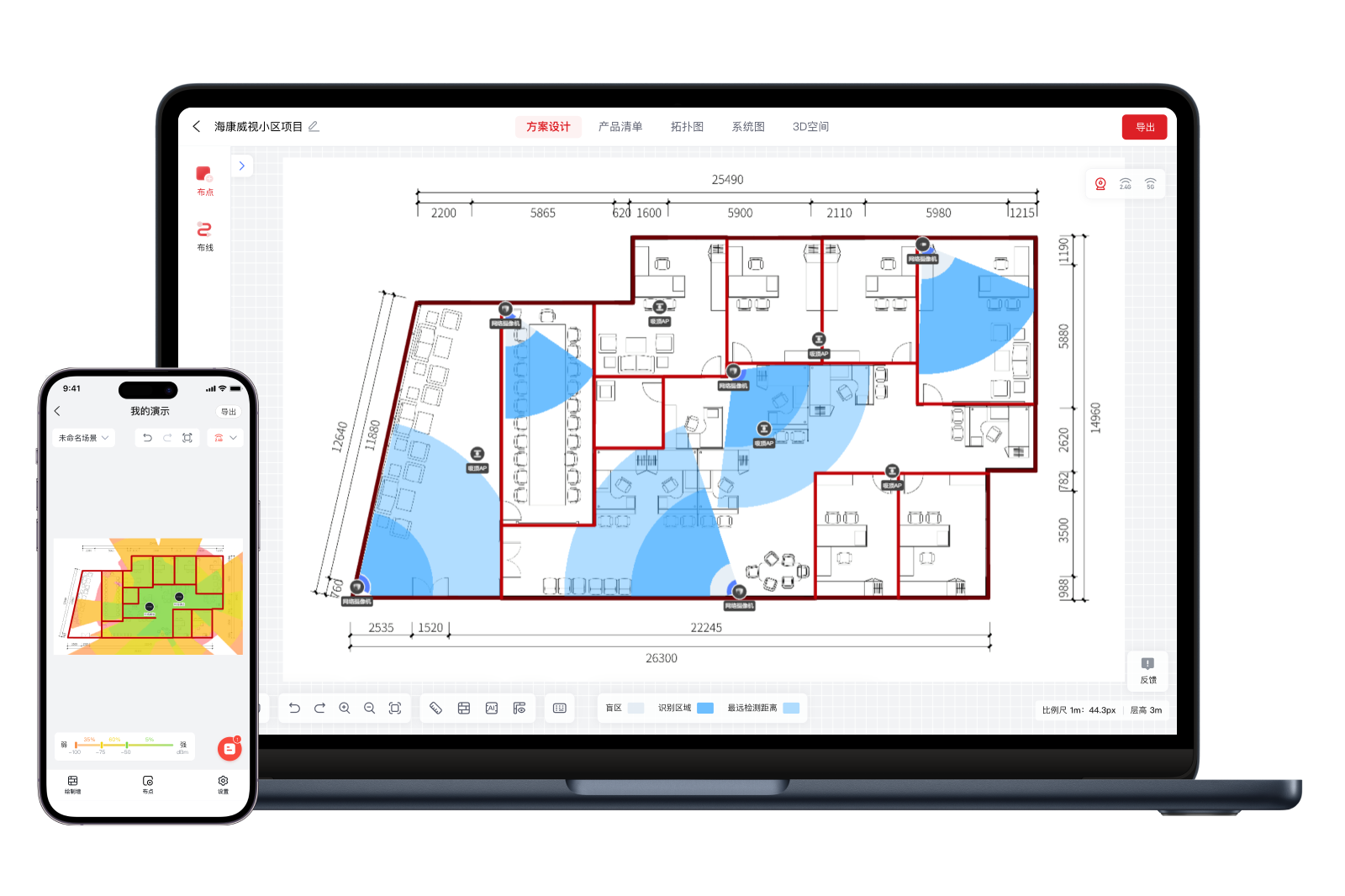 智能识别PDF、DWG等多种格式图纸,画图效率大幅提升,摄像机和网络覆盖范围可视化仿真,让你的布点有理有据看得见,无需手动走线和画图,支持电脑、手机双端设计,在哪里都能做项目,方案书快速生成。