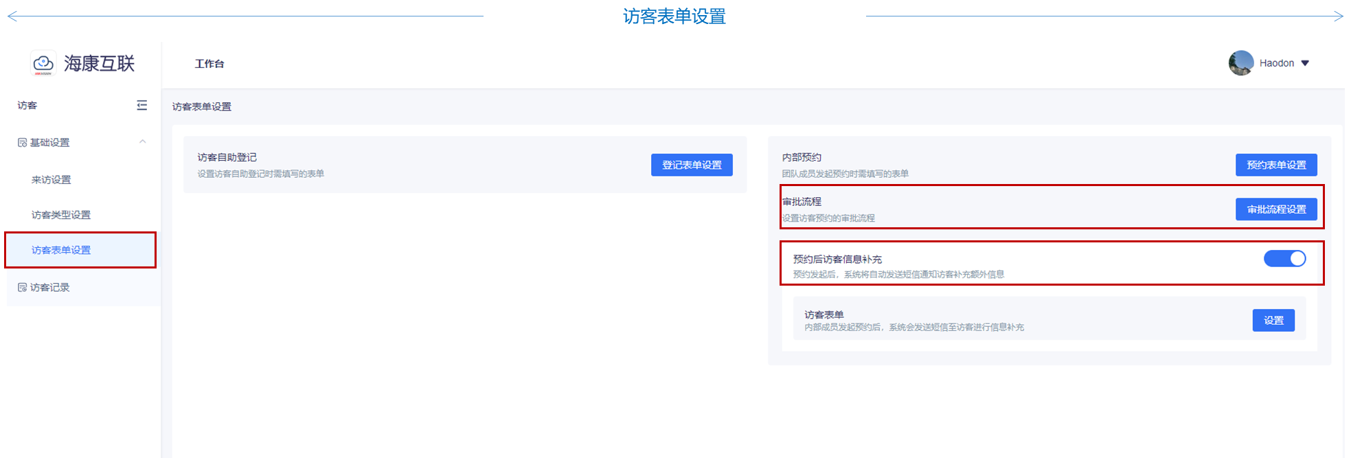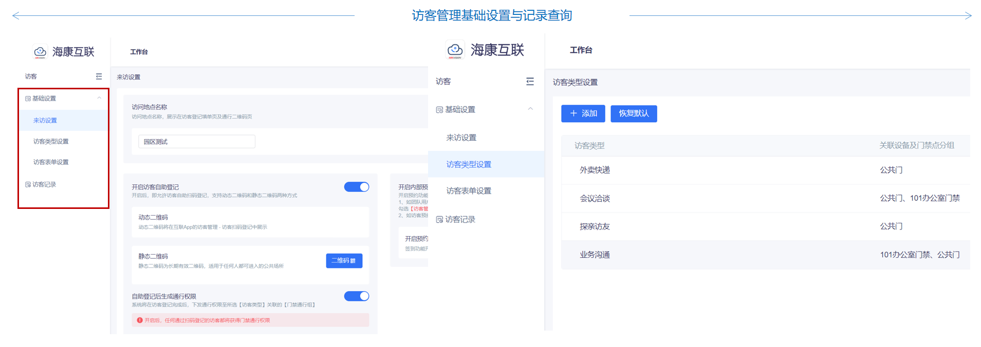 访客管理基础设置与记录查询:此模块针对管理员开放,首先通过海康互联web进入工作台,在工作台首页点击访客管理模块,进行访客管理基础设置操作。依次按照物业管理要求进行来访设置、访客类型设置、访客表单设置进行操作,完成相应配置。