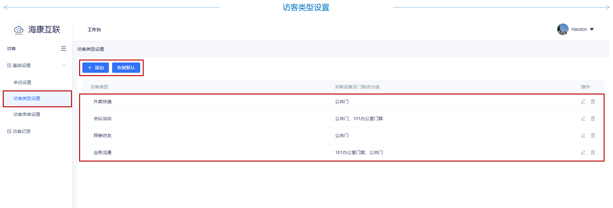 访客类型设置:管理员可结合公司管理需要,对访客类型进行编辑,并可针对不同点位门禁设备进行编辑,方便对访客信息统计分析。