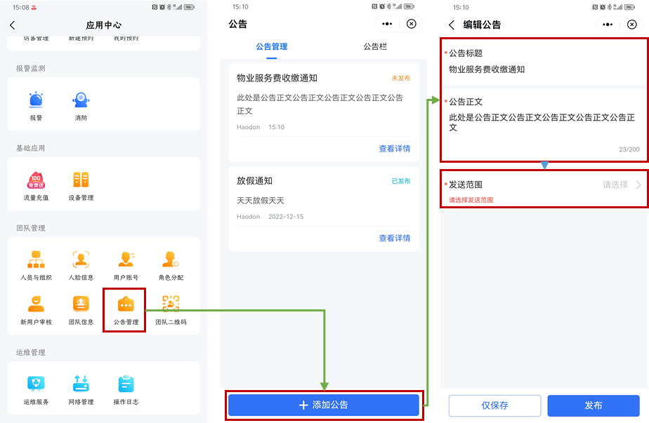 公告发布:在APP应用中心首页,团队管理部分,点击进入公告管理模块,通过点击添加公告进入公告编辑页面,对公告标题、正文进行编辑。公告编辑完成后,可通过发送范围选取公告接收对象,可满足针对全部人员、指定人员、指部门人员进行发放,同时支持公告撤回。