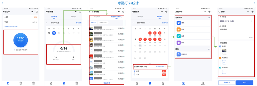考勤统计:管理员可查支持团队统计和我的统计,个人员工用户仅支持查看我的统计。管理员可在当天查看迟到人员、应到未打卡等人员信息。