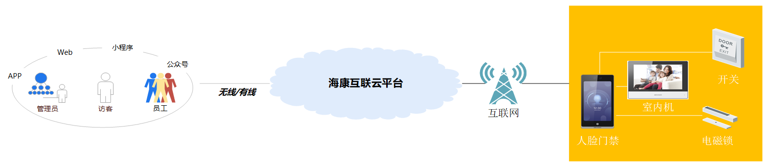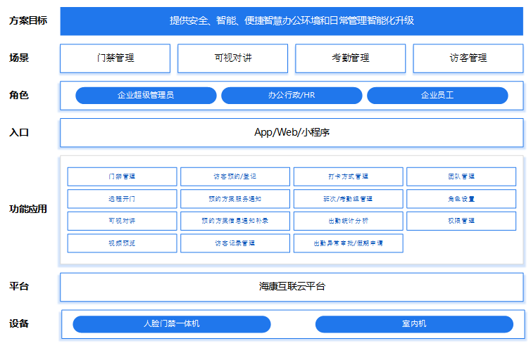 方案围绕传统写字楼管理粗放、智能设备较为基础的情况下,借助海康威视人脸门禁机、室内机,基于海康互联云平台进行门禁、可视对讲管理,提升办公环境安全管理。基于海康互联云平台SaaS应用,同时,提供互联网考勤管理、访客预约管理,大大提升公司管理效率和优化日常办公体验。