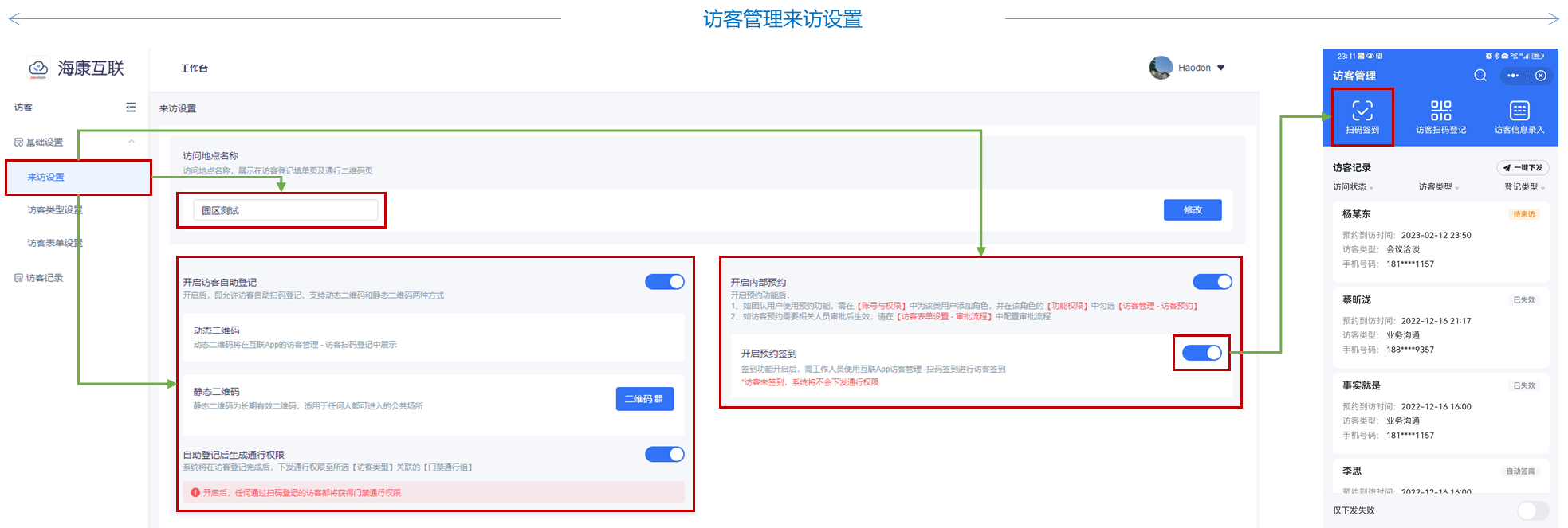 来访设置:通过海康互联Web端,来访设置模块进行访客登记和访客预约基础配置。其中,访客登记中,可针对访问地点名称修改、是否开启访客自助登记、是否允许通过自助登记生成通行权限;访客预约中,针对是否开启内部预约功能、是否开启预约签到功能。管理员若开启预约签到功能,则在管理员APP界面上显示扫码签到,需访客到访时,由工作人员进行扫码方可对访客权限进行下发,提升对外来人员安全管理。
