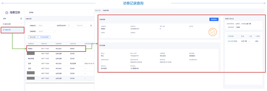 访客记录查询:访客记录支持Web和APP两个端口进行查询,满足对访客来访信息、权限下发状态进行细节查看。