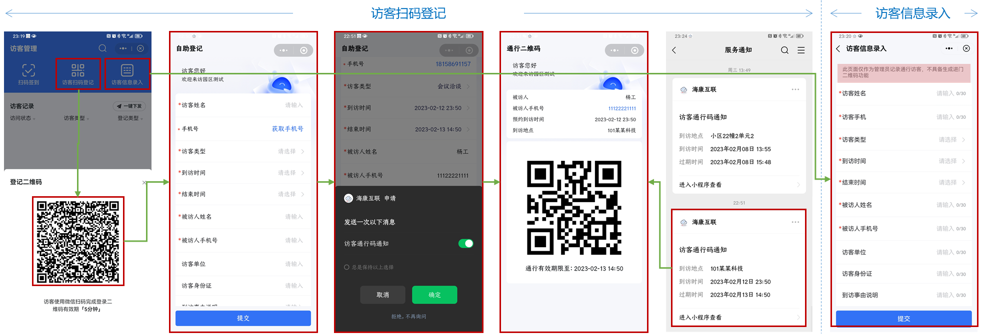 访客扫码登记:访客来访时,可由访客使用微信,对物业人员出示的登记二维码进行扫一扫,实现自助登记并确认提交,提交后生成通行二维码,并能通过自身微信消息记录的服务通知查看通行信息。