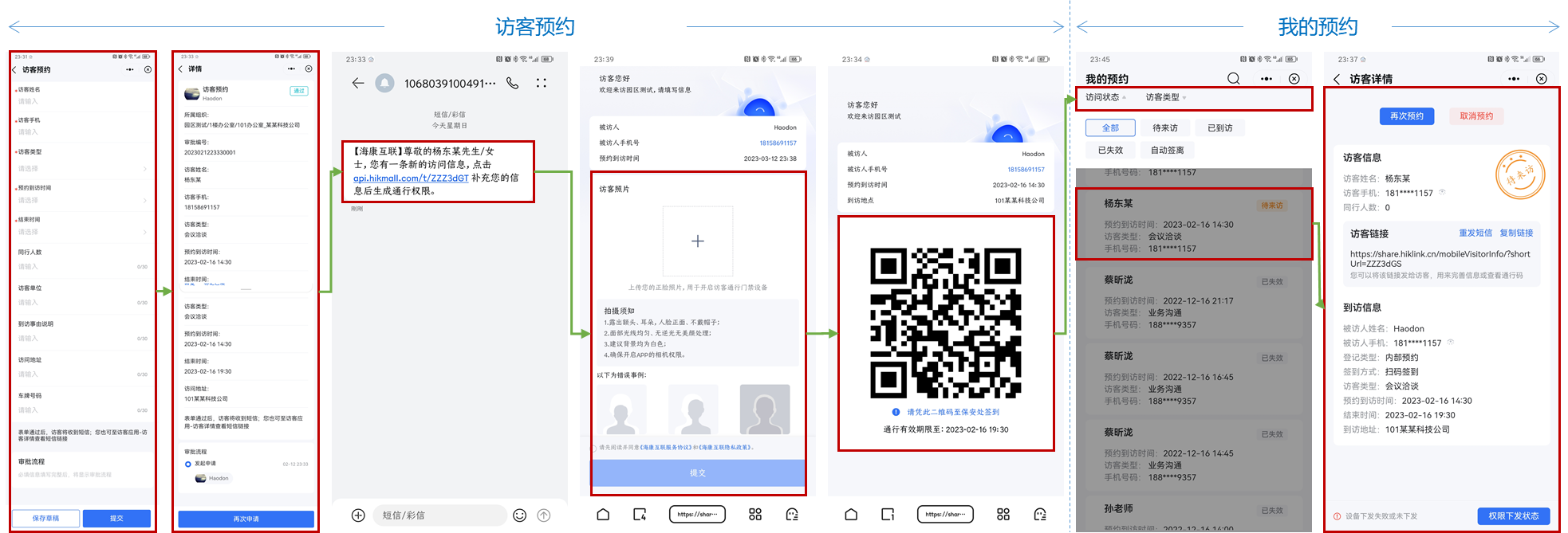 访客预约:通过海康互联APP应用中心首页,访客管理部分的访客预约模块,实现员工进行外来访客的预约管理。通过在Web端中开启内部访客预约后,内部人员可在APP中使用该功能。员工预约完成后,访客将收到访问信息补充的短信通知,按照页面要求操作,即可获取访客通行凭证,该凭证可通过短信中链接查看。