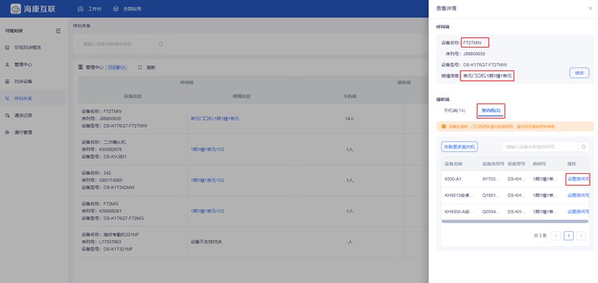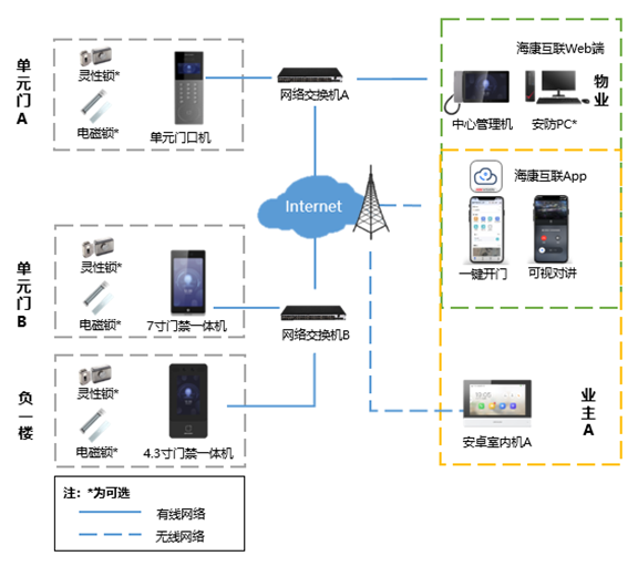 ③针对特殊需求家庭,可部署海康威视安卓室内机(不可使用非安卓系统室内机替换!!!),室内机连接业主家公网WiFi或网线,并添加至海康互联云平台,实现与单元门口机建立对讲呼叫关系(门口机与室内机设置为同一单元下)。